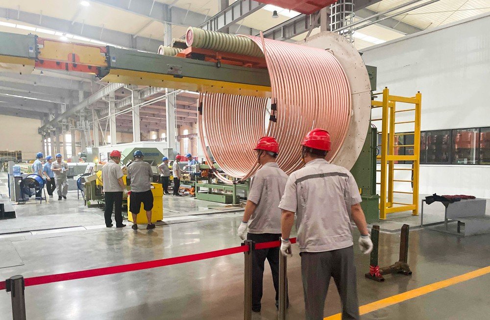 20:55,直管生產(chǎn)班組長于有龍根據(jù)客戶要求開始進(jìn)行Φ54×2直管的工藝試驗(yàn),精度方面必須先確保壁厚2mm不能出現(xiàn)負(fù)公差,再研究控制正公差;幾次試制下來,于班長最終定好拉制工藝,與直拉機(jī)師傅囑咐妥當(dāng)后,才和李祥鵬部長完成交接下班回家。李祥鵬部長、孫濤部長、楊書虎科長、高元陽科長、質(zhì)檢巡檢員羅學(xué)迅輪流駐在直管生產(chǎn)線進(jìn)行檢驗(yàn),把控精度公差,每10分鐘做一次檢測,確保生產(chǎn)出的銅管在客戶要求的范圍之內(nèi)。大直管粗重,拉制起來勞動(dòng)強(qiáng)度大要求條件高,四位直拉機(jī)員工師傅在高溫下很快汗流浹背,身上的工作服被汗水浸透,被散熱扇吹干了又濕、濕了又干,反反復(fù)復(fù)。李部長看在眼里、疼在心里,忍不住下手與員工師傅并肩一起干。